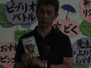 本校も読書には力を入れています。いろんなことを行っています。昨日の集会では、担当が読書について話をした後に、職員によるビブリオバトルをしました。ビブリオバトルとは、三分以内でそれぞれが児童に読ませたい本の紹介をします。その後、児童にどの本が一番読みたくなったかを問います。それで、一番人気があった本がチャンプ本となるものです。昨日のチャンプ本は「十五少年漂流記」でした。