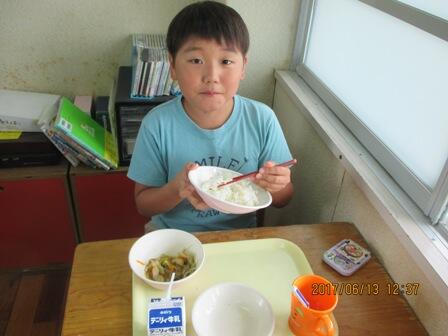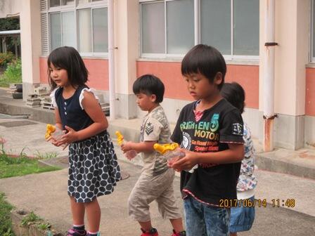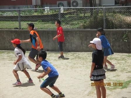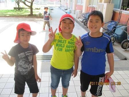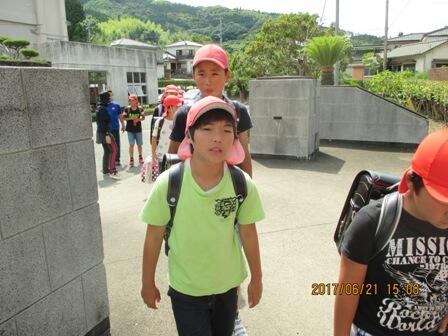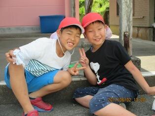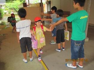 ・ 昼休み時間に、校舎と管理棟の間で運動場を見ていたら、2年生が「かわいいかえるをみつけました。」と、虫かごにいれた小さなかえるを見せてくれました。また、5年生女子も三人で「保健室に行きます。」と、横を通っていきました。