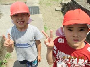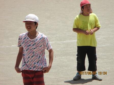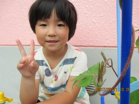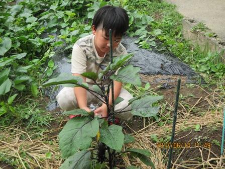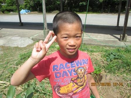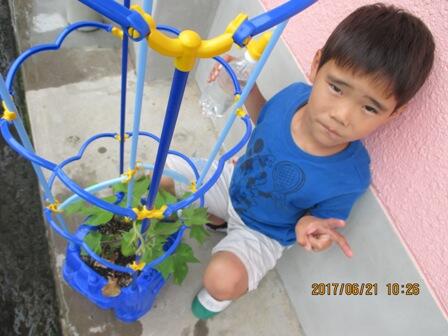 ・ こちらの学級は畑にいろんな野菜を植えて、定期的に世話をしています。とうもろこし、すいか、カボチャ、さつまいもなど、・・・・今日は担任と共にその世話をしていました。かぼちゃに小さく付いている実を、児童が大事そうに触っていました。収穫が楽しみです。