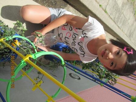 ・ 低学年は植物を栽培しています。1年生は、一鉢ずつあさがお、それに畑で野菜を育てています。2年生は一鉢ずつミニトマトを育てています。毎日、観察をしながらペットボトルで作ったジョーロで水やりをしています。畑には、すでになすびがなっていました。