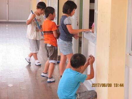 ・ 今日は掃除をしている児童の写真を何枚か撮りました。児童数は減少していますが、(この2年間で19名の減少)掃除場所は変わらないので、児童の掃除分担の場所が多く、その分、割と熱心に取り組んでくれます。