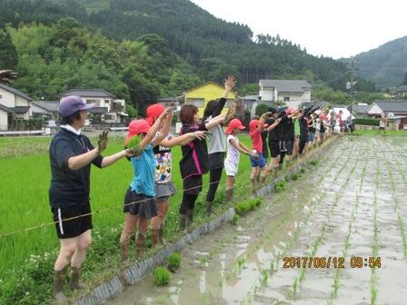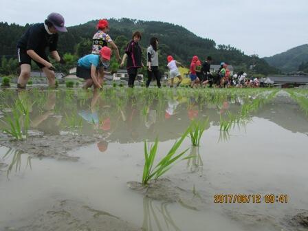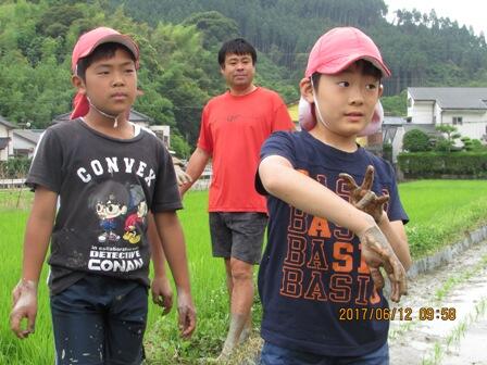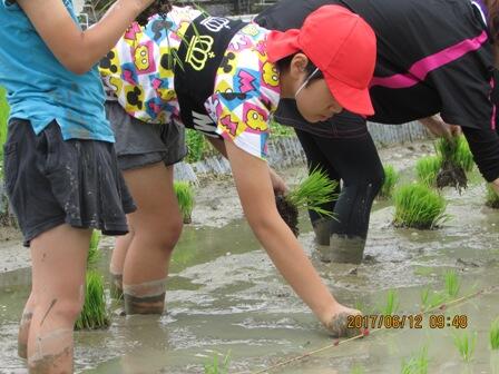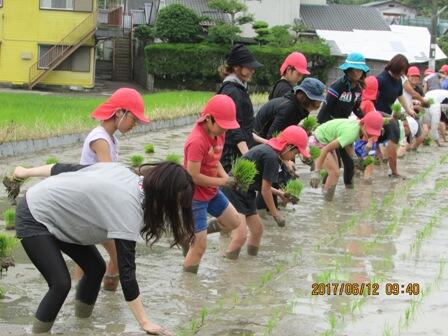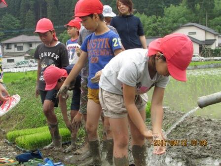 ・ 今日は5年生が田植えをしました。全てを手植えするため、ある程度の時間が必要と考えていました。しかしながら、桜ケ丘地区の方をはじめ、保護者の方も10名も来て下さったおかげで、1時間と少しで終了することが出来ました。まずは感謝です。子どもたちのほとんどが「初めて」のようでしたが、そんな周りの大人の方々のサポートにより、楽しく充実した活動になりました。次は時々観察をしながら、かかし作り、10月下旬の稲刈りです。また、桜ケ丘地区の方には、田の水の調節、草払い、施肥等で日常的に大変お世話になります。どうぞよろしくお願いいたします。