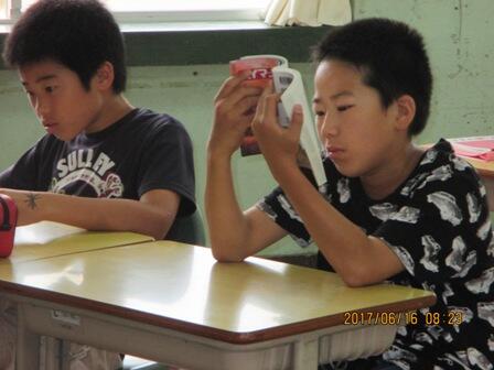 ・ 今日も雨なので、体育館使用の学年以外の子どもは室内で過ごしていました。勉強の続きをしている子ども、読書している子ども、何となく過ごしている子どもなど、いろいろでした。