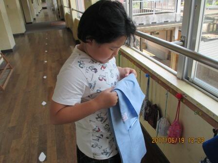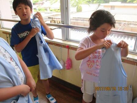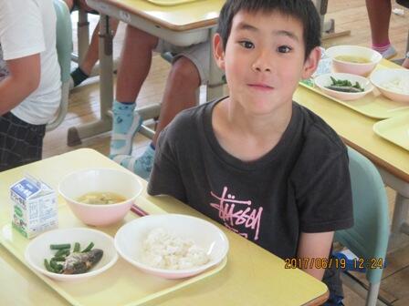 ・ 給食当番が終了後には、当番は廊下で給食着をぬいで、たたんで直します。たたみ方は、1,2年時に教師がついて指導をしています。写真は、今日の4年生の様子です。ほとんどが、指導されたとおりにきれいにたたんで袋に入れていました。ちなみに、今日のメニューは「麦ご飯、豚汁、鰯の甘露煮、いんげん、牛乳」でした。