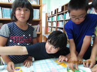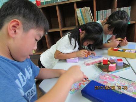・ 先日の低学年対象読書祭りに続き、今日の昼休み時間には高学年対象の読書祭りを図書委員会が主体となって開催してくれました。本に親しむ、読書を好きになるための取組の一つで、今日は図書司書さんが読み聞かせをした後に、しおり作りをしました。低学年同様、しおりの台紙にスタンプを押したり色紙やシールを貼ったり、絵を描いたりしたものをラミネートしてひもをつけてできあがりです。多くの子どもたちが真剣な表情でしおり作りに没頭していました。完成したしおりは「コンクール」を開き、入賞作品を表彰します。