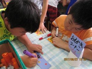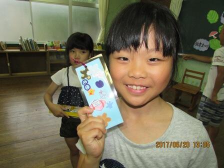 参加した子どもたちは、準備されたシール、マジックやクーピー、スタンプ、色紙などを使って、独自のしおりを作っていました。作ったしおりはラミネートをしてひもをつけてできあがりです。それをコンクールして入賞作品を決めるようです。さて、どの作品が賞をsるのでしょうか?