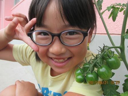 ・ 2年生がミニトマトを育てています。毎日、水をあげたり観察をしたりしながら育てています。今は、ほとんどの苗に緑の実がなっています。2年生は収穫を楽しみにしているようです。