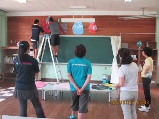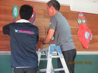 男性職員が二名で低学年図書室の前面壁面にはっていました。