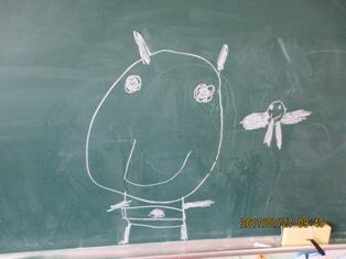 これ、ある教室の黒板に今、描いてありました。子どもが描いたアートです。