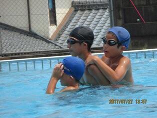 ・ 最近は「暑いですね」が挨拶代わりの言葉になっていますが、本当に暑いというか「熱い」ですね。熱い時には、身体を冷やしたい気持ちからより水に親しみを感じます。とは言っても、水難事故にはくれぐれも気をつけて下さい。昨日は栄松で事故がおきたようです。命の再生はありません。注意できるだけは注意していきましょう。昨日のプールの様子を紹介します。