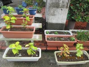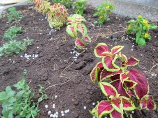 アメリカンブルー、コリウス、メランポジューム、秋までは大丈夫です。玄関前の花壇に植えている青々とした葉の花はトレニア、これは全て去年のこぼれ種から芽が出て、あちこちで育っていたのを拾って植え替えました。