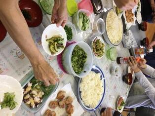 ・ 今日の昼食はみんなでもちよった数種類の料理と、休憩時間に「ぱっ」とゆでていただいたそうめんをいただきました。時間のけじめはつけながら、夏休み中は、じっくりといろんなジャンルの研修をしたり、校区内を巡回したり、作業をしたりするなど、普段はなかなか出来ないことを計画的に行い次の学期に備えています。