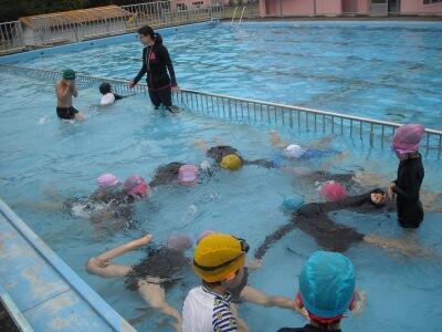 今日は、1・2時間目、1~4年生が水泳の授業を行いました。本校では2学年合同の水泳の授業を、職員3名以上の体制で行っています。事故なく安全に実施できるように注意しながら行っています。1・2年生は「だるま浮き」「ふし浮き」の上手な児童をお手本に何回もチャレンジしていました。「けのび」も上手にできる子も出てきました。