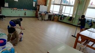 桜ケ丘小学校は、学年を縦割りにして(いろいろな学年で構成して)、そうじをします。ただし、現在は、感染症の拡大防止策として、ひとつの場所を同じ学年で、そうじしています。教室は人数が少ないので、一人一人がとってもがんばっています。