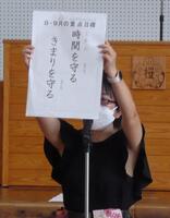 次に、生徒指導担当の先生が、9月の目標「時間を守る きまりを守る」について話をしました。