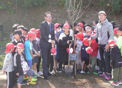 もう一度全校児童と保護者が集合し、体育館で記念動画を鑑賞した後、体育館の横に桜の木を記念植樹しました。