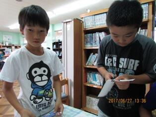 ・ 先日の低学年対象読書祭りに続き、今日の昼休み時間には高学年対象の読書祭りを図書委員会が主体となって開催してくれました。本に親しむ、読書を好きになるための取組の一つで、今日は図書司書さんが読み聞かせをした後に、しおり作りをしました。低学年同様、しおりの台紙にスタンプを押したり色紙やシールを貼ったり、絵を描いたりしたものをラミネートしてひもをつけてできあがりです。多くの子どもたちが真剣な表情でしおり作りに没頭していました。完成したしおりは「コンクール」を開き、入賞作品を表彰します。
