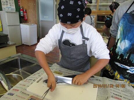 ・県委嘱の食育コーディネーターの方に来ていただき、保護者の協力も得て今年も(3年目)6年生が飫肥の天ぷら風を調理しました。今年が今までと違うのは、トビウオをさばくところから始めた点です。今朝、目井津港に水揚げされた10匹のトビウオをコーディネーターの方が早朝に仕入れて下さり、その生きのよい魚を子供たちがさばくところから始めました。