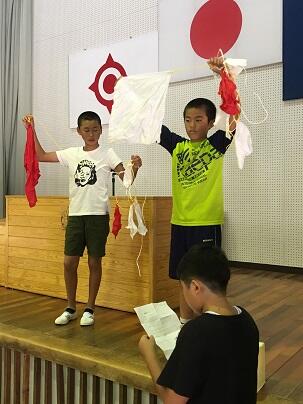 ・ まず、団長に赤、白の決定くじを引いてもらいました。ひもをひっぱって、ひっぱって、その先にある大きな旗が団の色でした。
