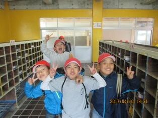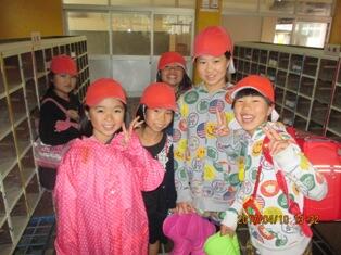 ・ 下校前に靴箱のところで撮りました。今日はあいにくの雨でしたが、明日からは回復しそうです。新しい学年に進級し、また元気に運動場を走り回って下さい。さようなら。