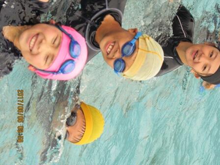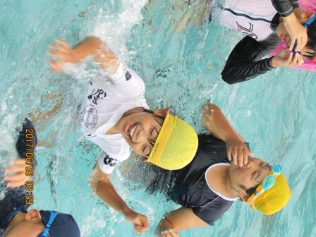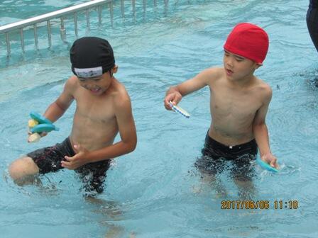 ・ 今日はプール開きをしました。天気は曇りで、はじめはやや寒いような気もしたのですが、子どもたちの多くが、今年初めての水泳(水遊び)の授業を楽しんでいました。