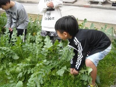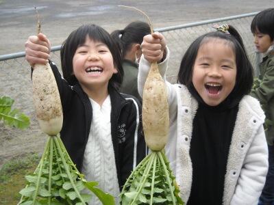 1年生が生活科園で育ててきた「ダイコン」の収穫をしました。一人ひとりが気合いを入れて、「うんとこしょ どっこいしょ!」と引き抜いていきます。全員満面の笑顔です。全部で63本収穫できました。写真撮影のかけ声も「うんとこしょどっこいしょ!」でした。