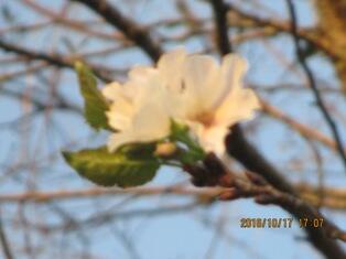 ・ 昨日、自宅のサクラの木を見ると白いものがちらほら、近くに行ってよく見てみると、「花」・・・毎年、春には満開になり楽しませてくれますが、今の時期に「花」とはびっくりです。