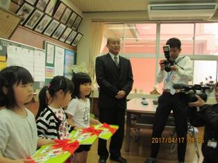 ・ 毎年、王子製紙日南工場から新入児童に対してスケッチブックが一人一冊ずつ寄贈されます。その贈呈式が市内の代表として本校で開催されました。この寄贈は、昭和49年から続いているもので今回で44回目になります。すごいですね。ありがたいです。保護者の中にも市内の小学校に入学されたのならば、いただいていらっしゃる方がいると思います。贈呈式には、王子製紙日南工場から2名、市教委から3名が来校され、新入生の代表3名がスケッチブックをいただきました。そしてその後、教室で活動の様子をご覧いただきました。