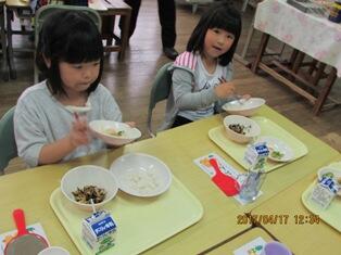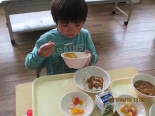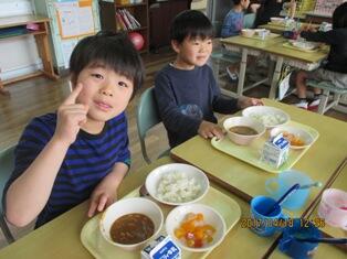 ・ 今日は、チキンカレー、牛乳、フルーツポンチと、子供には人気のあるメニューでした。1年生にとっては二回目の給食、まだ硬い表情がありながらもほとんど完食していました。