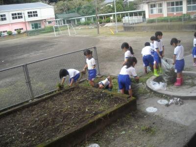 今日の1年生は朝から花壇の草取りに汗を流していました。夏休みの思い出と2学期のめあてを紹介します。
