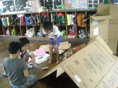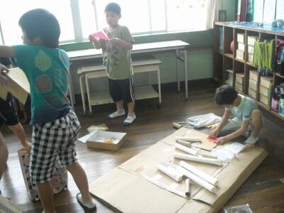 2年生の教室には沢山の段ボールが置かれ、子どもたちの「おもちゃづくり」の準備がされていました。グループに分かれて、目を輝かせておもちゃづくりに没頭していました。