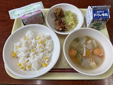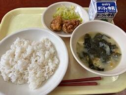 今日の給食の献立は「まる麦ごはん、豚汁、じとっこ三色丼」でした。丼の具は、じとっこのお肉に生姜のよい香りが加わり、枝豆との相性もよく柔らかく煮てありました。豚汁は根菜類がふんだんに使われており、心も体もホットになりました