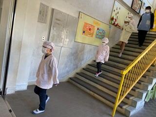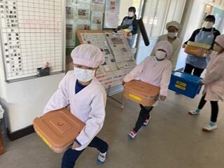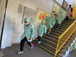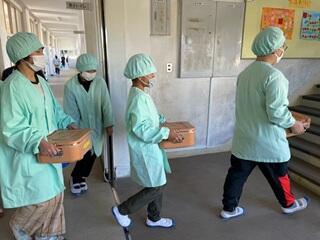 給食当番は、いつも整然と並んで移動して、少ない人数で協力して運んで配膳しています