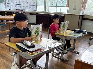 複式指導では、教科によっては、担任が学年をわたりながら半分ずつ指導をします。担任がいない側の学年は、自力解決をしたり、ペア・小集団での課題解決を行ったりしています。6年生ともなると、しっかりと学習のスタイルが身に付き、自分達でどんどん学習を進めています。すばらしいにっこり