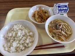 今日の給食は、「きつねうどん、ツナのゴマ油いため、減量麦ごはん」でした。