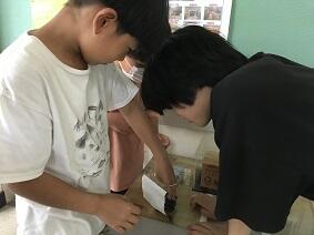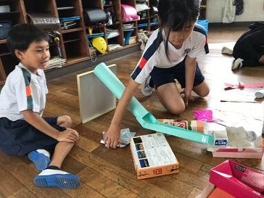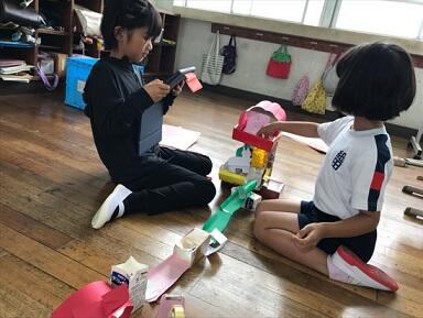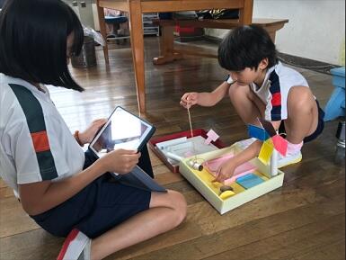 3・4年生は、図画工作で「コロコロガーレ」という作品作りでした。できた作品をペアで確かめていました。ここでも、タブレットを使って出来栄え(転がり具合など)を確かめていましたにっこり