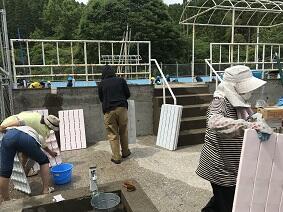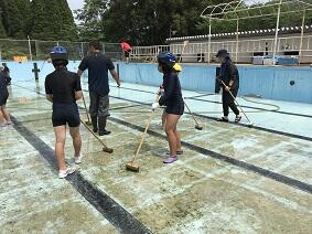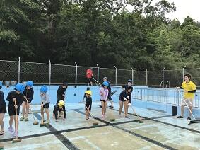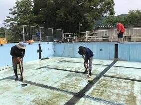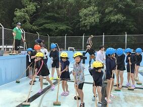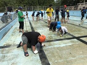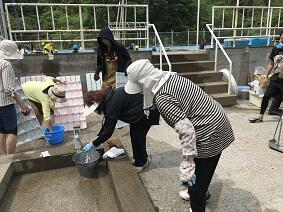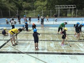 両校の子ども達、保護者、教職員、そして地域の方々が、みんな一緒になってプール掃除を行いました。