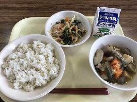 今日の給食は「麦ごはん、炒り鶏、小松菜のおひたし」です。配膳中の2階に上がると、炒り鶏のいいにおいが廊下にただよっていました。少し大きめにカットされた野菜・根菜・タケノコは食べ応えがありました笑う おひたしは、きざみ揚げがいいアクセントを出していました。どちらもたいへん美味しくいただけましたキラキラ