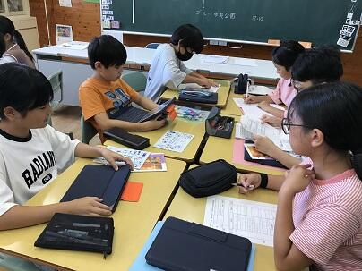 5・6年生は、修学旅行で学んだことを、タブレットでまとめていました。「修学旅行のしおり」に自分の学びを記録しているので、それを見返しながら”デジタル新聞”形式でまとめて、修学旅行の振り返りをしていましたにっこり