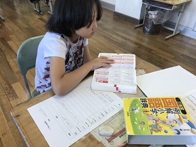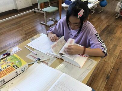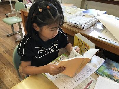 2校時に5・6年教室をのぞくと、教室の前方では5年生が先生と短歌の学習を進めており、教室後方では6年生が物語文「風切るつばさ」を読んで出てきた新出語句を調べていました。辞書を使って調べ、言葉の意味をノートに静かに書き留めていました。
