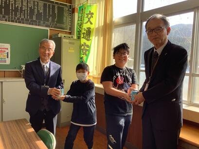 代表の5・6年生が手渡しし、会長さんからお礼の言葉をいただけました 校長からは、年末の子ども達の活動の様子・がんばりについての報告・紹介があり、最後に記念撮影をして終了しました。