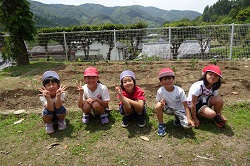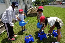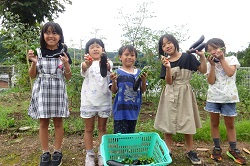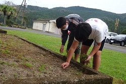 1,2年生がサツマイモやピーマン、トマトなどの野菜の苗を学校園に植えました。