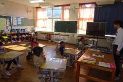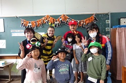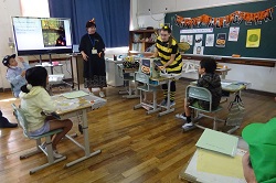 ハロウィンを教材に、外国語活動を楽しんでいる1年生から4年生です。