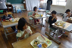 ハンバーグをパンに挟んで食べました。一年生も上手にできました。