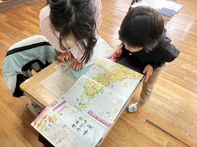 特産物などの情報を元に、どの都道府県かを調べています。 特産物が「りんご」なら→「青森県かな?」→地図帳で調べてみると、特産物が絵で表されているので、候補が絞られていきます。そして、次の特産物のヒントが出て、、、と繰り返し、友達とも情報交換しながら都道府県を特定していくということをやっていました。楽しそうでした