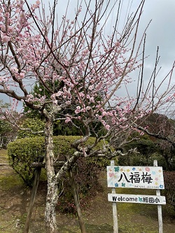 正門のそばにある紅梅が満開で見事です。この梅は8年前の卒業記念樹で、当時の卒業生の人数から「八福梅」と名