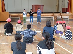 担当は、2組担任の先生です。みんな、しっかりと先生のお話を聞いています。
