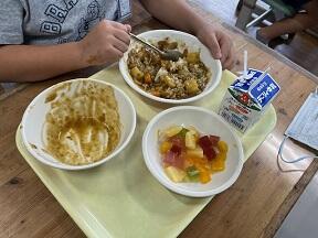 そして、今日から早速、1年生初めての給食です! 子ども達の人気メニューのカレーとフルーツポンチでした。