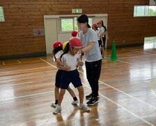 2人組を作ってボールを運んでリレーする運動もしました。背中でボールを挟んで落とさないように気を付けながらボールを運び、次の2人組にバトンタッチします。やる側も見る側(応援する側)も、思わず笑ってしまいます。不思議ですが、うまくいってもいかなくても、笑みが自然とこぼれてきます!(^^)!