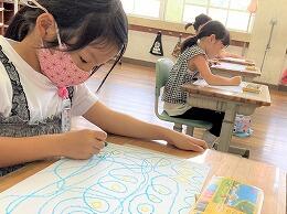 本日の1・2年生の図工です。それぞれクレヨンで描いた絵に、これから水彩絵の具を使って色をつけていきます。